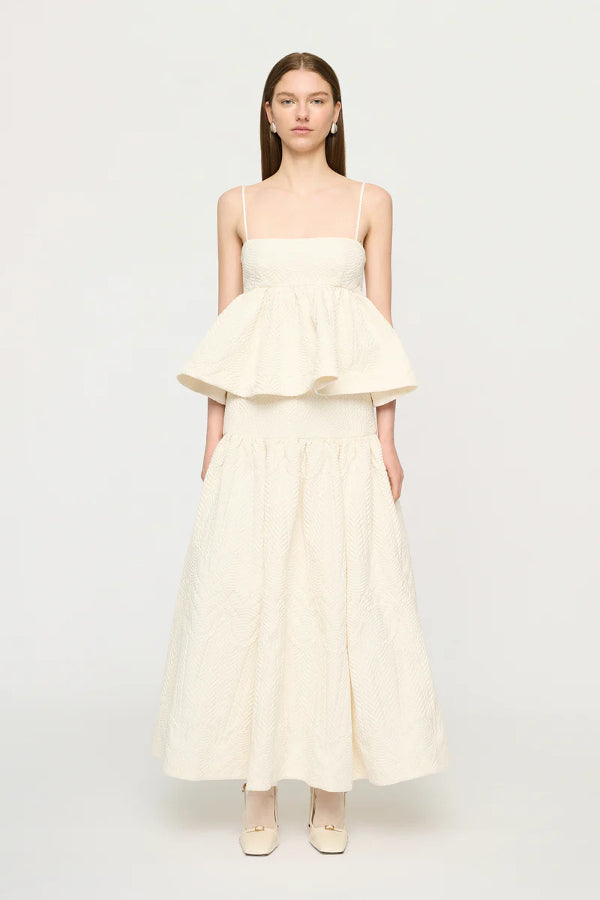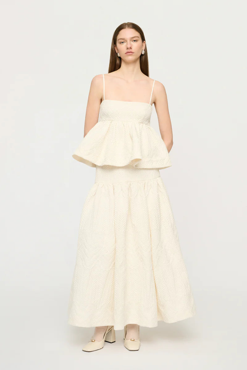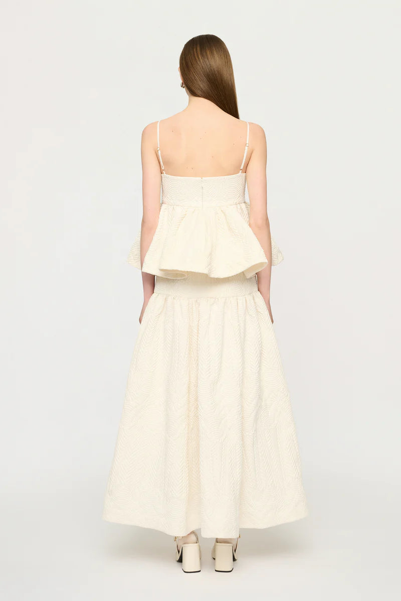 Crafted from a luxurious textured jacquard fabrication, the Rolf Jacquard Top showcases an exaggerated peplum silhouette that adds a playful yet refined dimension to your wardrobe.
