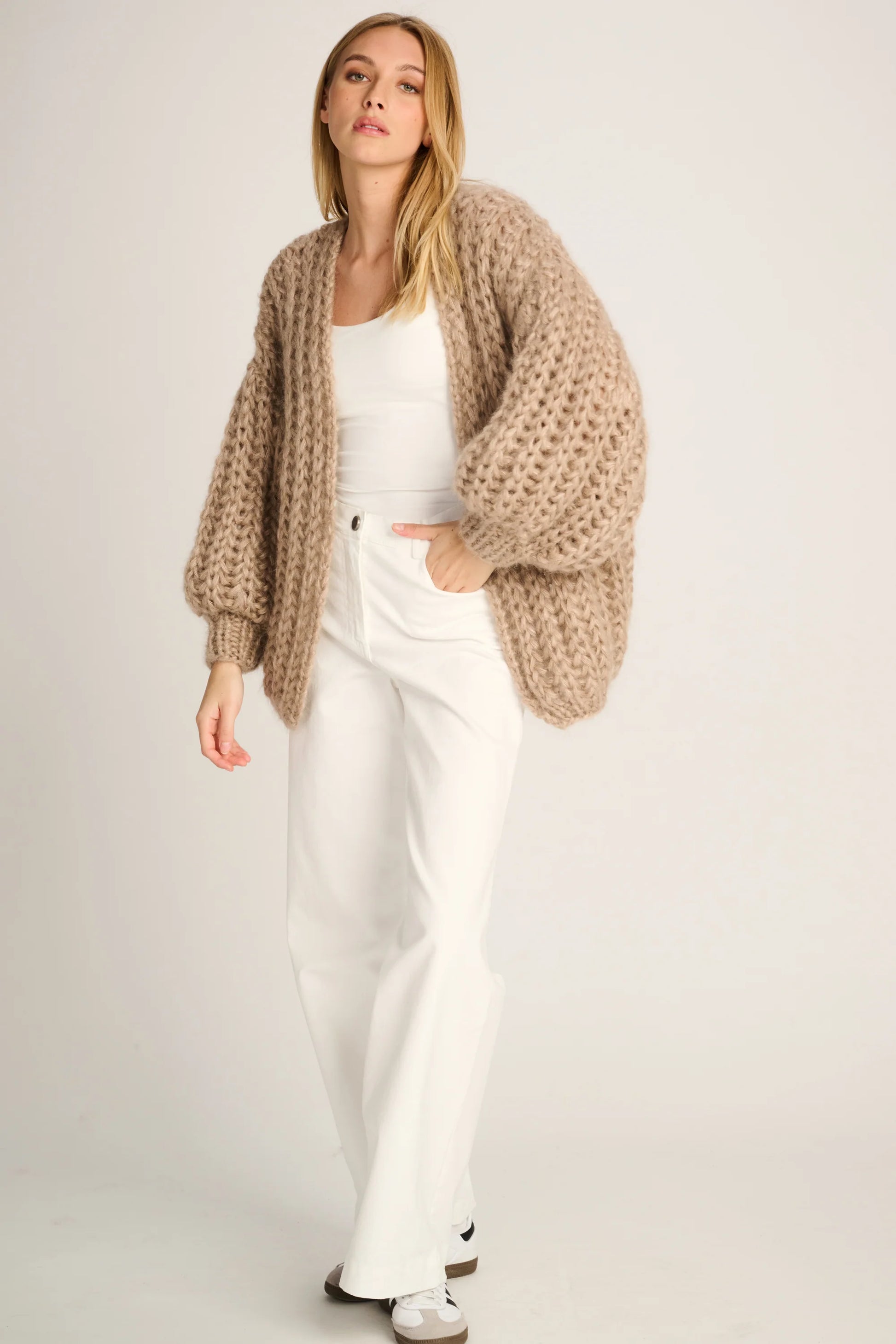 Elevate your knitwear collection with the Audrey Cardigan in a timeless ribbed beige. Crafted in Belgium from a luxurious blend of 75% super kid mohair and 25% silk, this cardigan offers a soft, airy feel with a touch of relaxed sophistication. Its open-front design and ribbed texture make it a versatile layering piece, perfect for adding warmth and style to any outfit.